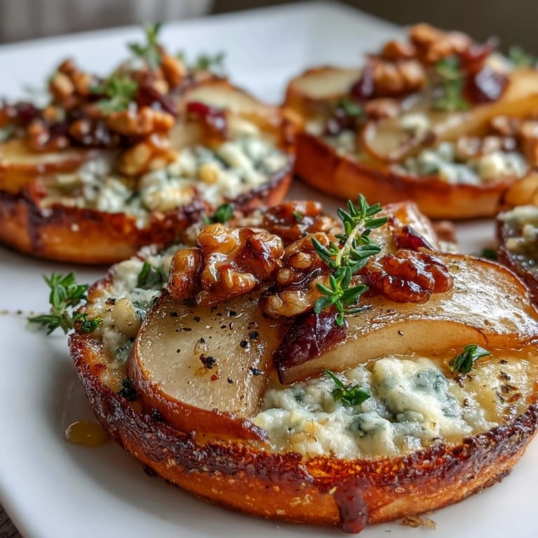 Save to Pinterest My neighbor knocked on the door one Saturday afternoon with a jar of pickled walnuts her aunt had sent from England. I had no idea what to do with them until I remembered the pears sitting on my counter and the Gorgonzola leftover from a cheese board. What started as kitchen improvisation turned into these little pizzettes that disappeared in minutes when friends stopped by that evening. The combination of sweet, creamy, and tangy felt like a happy accident that I now make on purpose.